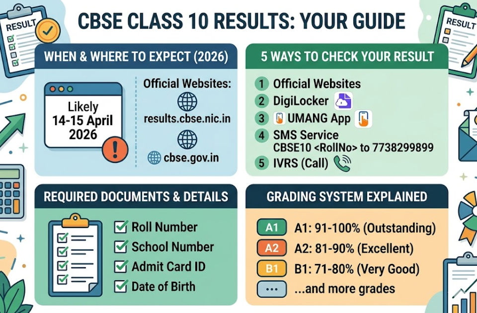 2026 की बोर्ड परीक्षाओं के लिए CBSE कक्षा 10 के Results अप्रैल 2026 में आने की उम्मीद है; ये नतीजे results.cbse.nic.in और cbse.gov.in पर उपलब्ध होंगे। छात्र अपने रोल नंबर, स्कूल नंबर, एडमिट कार्ड ID और जन्म तिथि का उपयोग करके अपने Results देख सकते हैं। ये results DigiLocker और UMANG app के ज़रिए भी देखे जा सकते हैं।